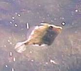 | 「アミメハギ」 ほぼ実寸。私のお気に入りのひとつ。ハギ系の魚は(フグとかも) 泳ぐとき尾を使わず、他のヒレをピロピロ波立だせて泳ぐところが かわいい。 |