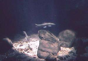 「イワナ」 水族館を出ると、帰りの順路の隅に「淡水魚館」が あります。ナマズとかモツゴとかオイカワとか海でな く、川釣り育ちの私には、懐かしい魚が多い。 |