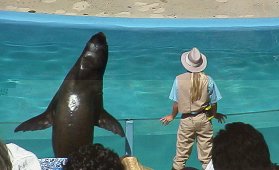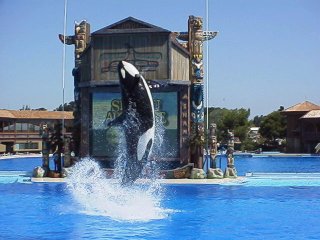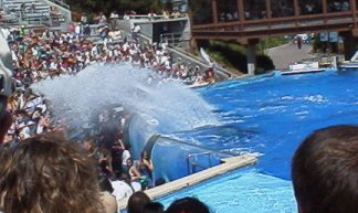 | スプラッシュ! みんな、水かぶるの大好き。子供は水槽にがぶり寄り。そして、シャチもイルカもクジラもアシカも容赦ないサービス!サービス。ただし、気候がカラッとして乾燥しているので濡れてもすぐ乾く。しょっぱいけど。イルカのショーでは一番前に座ったため、デジカメが結構危険な状態になった。大袈裟に言うと、水をかけることによって観客をストーリーに参加させショーへの一体感をあおることができるのは大きなアドバンテージではないか。 |