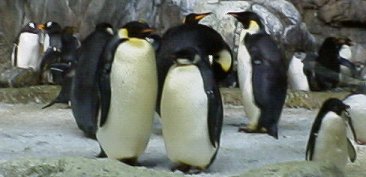 コウテイとオウサマ: 初めてコウテイ陛下に会った。でも、噂で聞いたほど大きくないぞ。なんか長崎のキングペンギンと変わらない気がしたのは何故?大きさで区別できないのでろば氏が首周りの模様で判別する方法を編み出す。この左の写真に写ってるのは・・・・ どっちか忘れた。 |