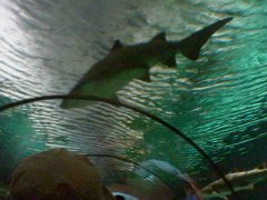 | どうもアメリカ人は鮫が好きらしい。ここでも、鮫はきちんと独立して「サメ館」のようなものが設置されていた。入るとまずは水槽の上からサメを眺められる。そしてさらに地下に潜ると水槽の下にガラスドームに囲われたムービングロードがあり頭上を牙剥き出しのサメがゆったり通過するのを眺められる。 | ![]() |