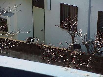 | 98/02/27 「窓からにゃんこが見える」 鯖家の日課。朝起きると窓からベランダの外を見下ろします。今日は2匹いました。多いときはこの黒猫のいるところに3匹でにゃんこだまができます。エアコンの室外機なので暖かいらしいのです。1匹もいないと悲しくなります。 |
