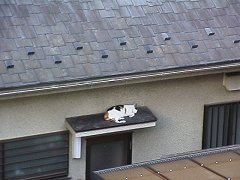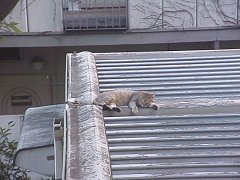 午前0:30頃からしづしづの陣痛が始まり、午前6:30我慢の限界に達し、まさに病院へ移動しようというとき、ふと窓から外を見ると、みけせんせいが朝寝をしていた。なんかうまくいきそうな予感がした。 |