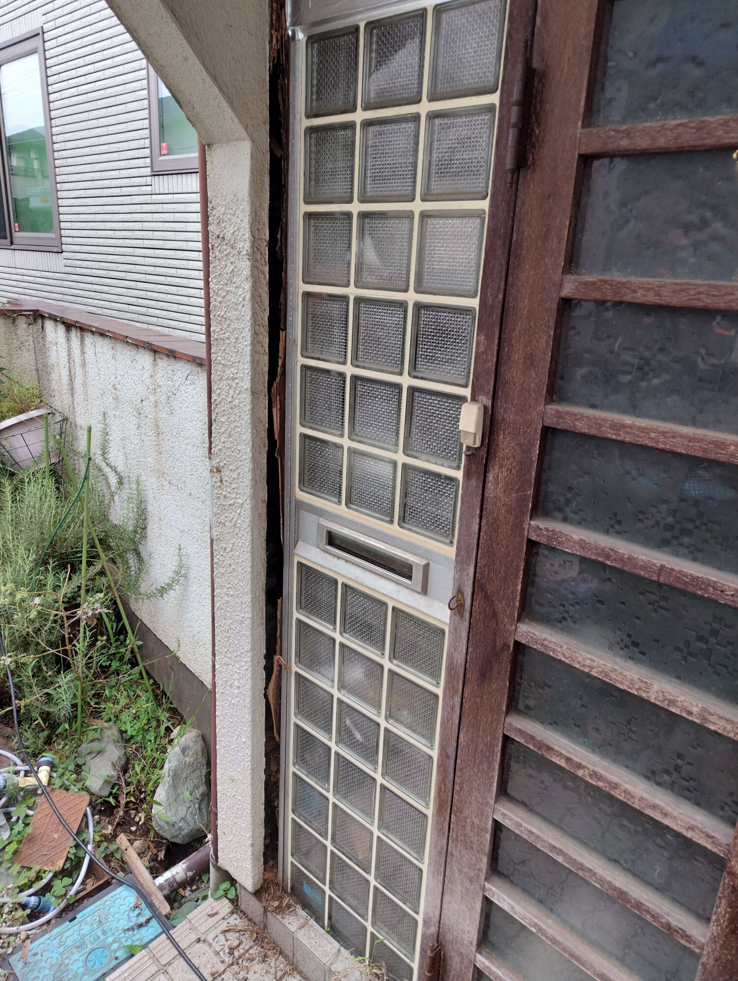 玄関の横の木材が朽ちて穴が開いている。もうあからさまにまずい状態。そもそも住居としてどうかというツッコミはなしで。
