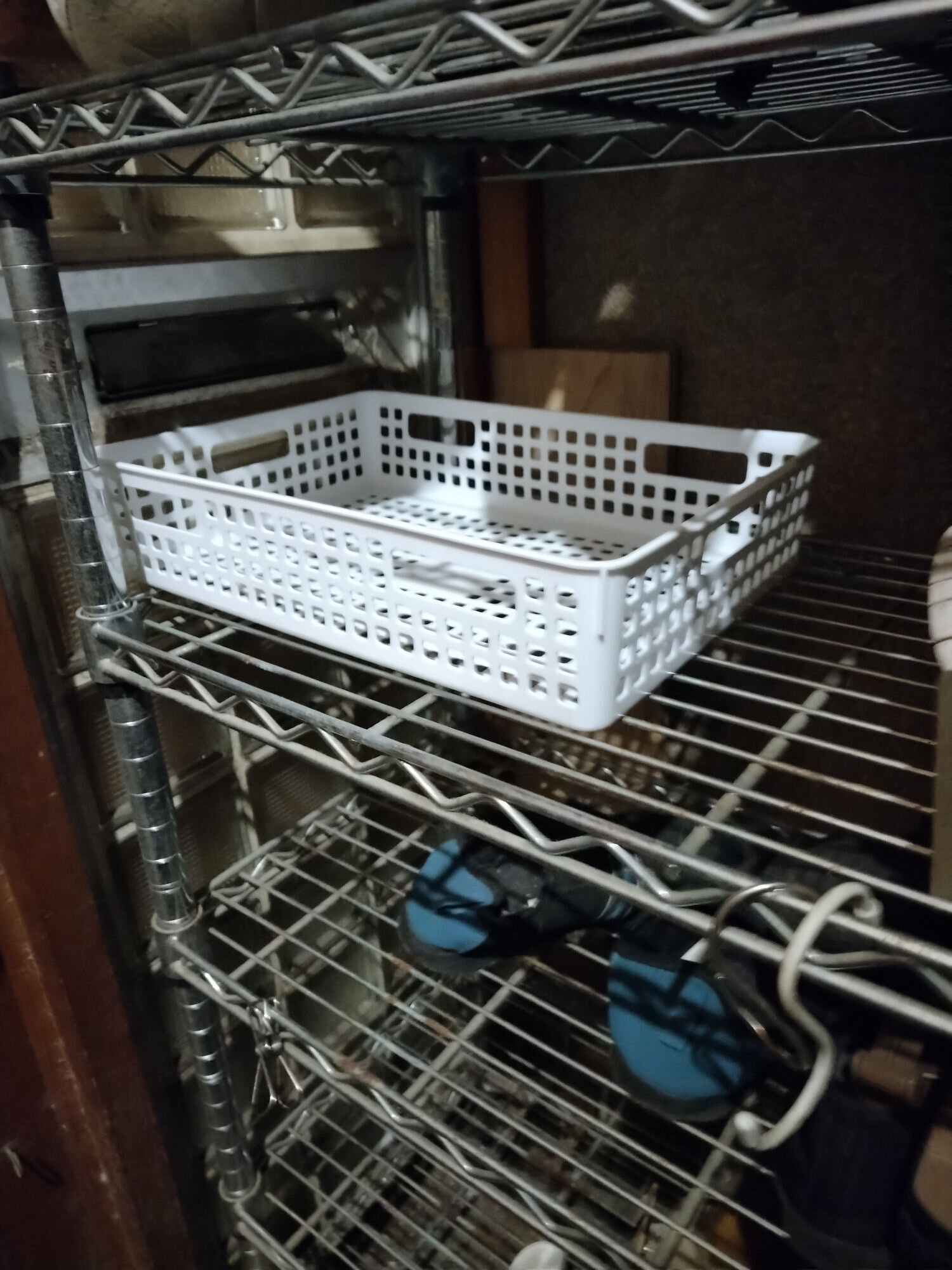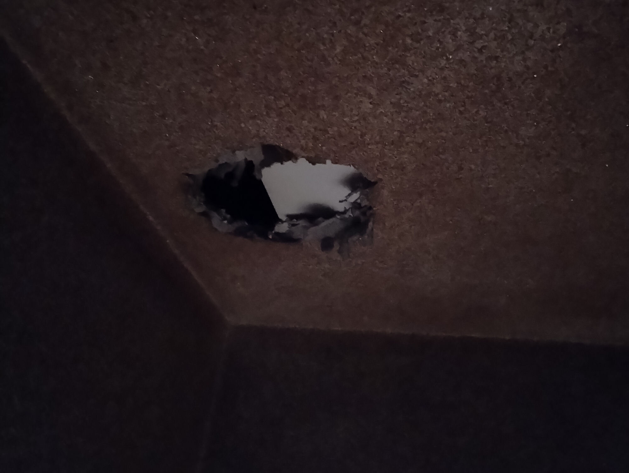 そもそもここに引っ越してきたときからあった穴。階段の天井部分。穴の向こう側は2Fの寝室の押し入れの下の空洞部分。ひみつの隠し部屋ドリームだが、死体が隠してあってもいやなのでなんとなくそのまま放置していたが、忠太が通っている可能性は否めない。一応、スマホを突っ込んでぐるっと動画をとってみたが穴らしい穴は見当たらなかった。しかし、疑わしきは罰せよということでふたをする。ただ穴の周りが砂壁みたいなやつなので直接釘とかテープとかで補修ができない。