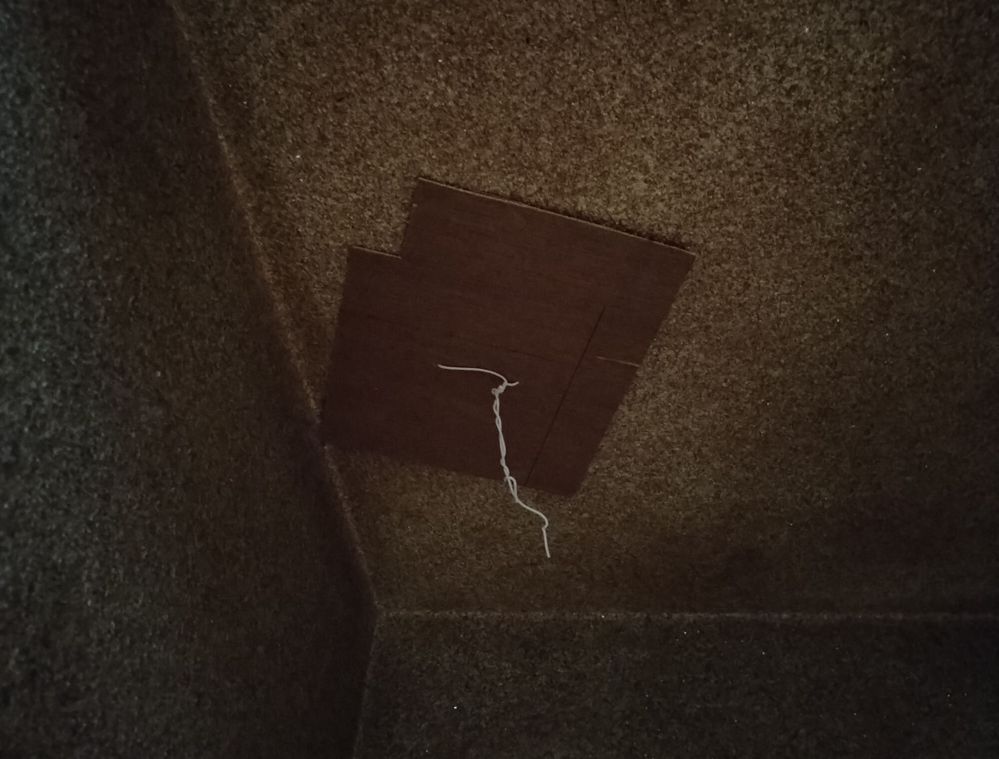 ということで、屋根裏側に細長い板を入れてこっち側のベニヤ板と針金で挟み込む作戦。