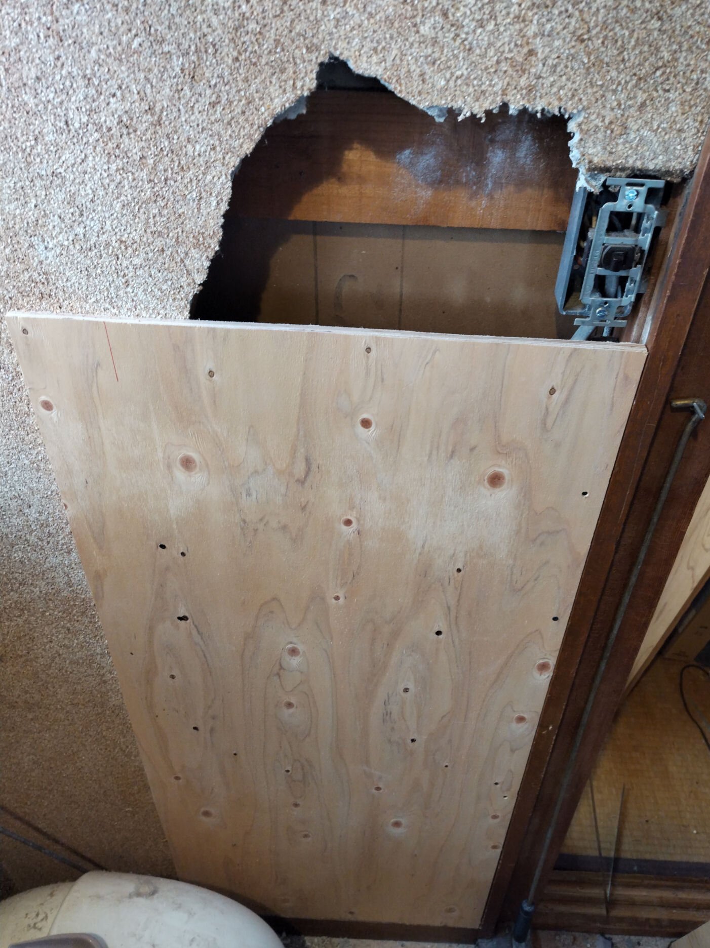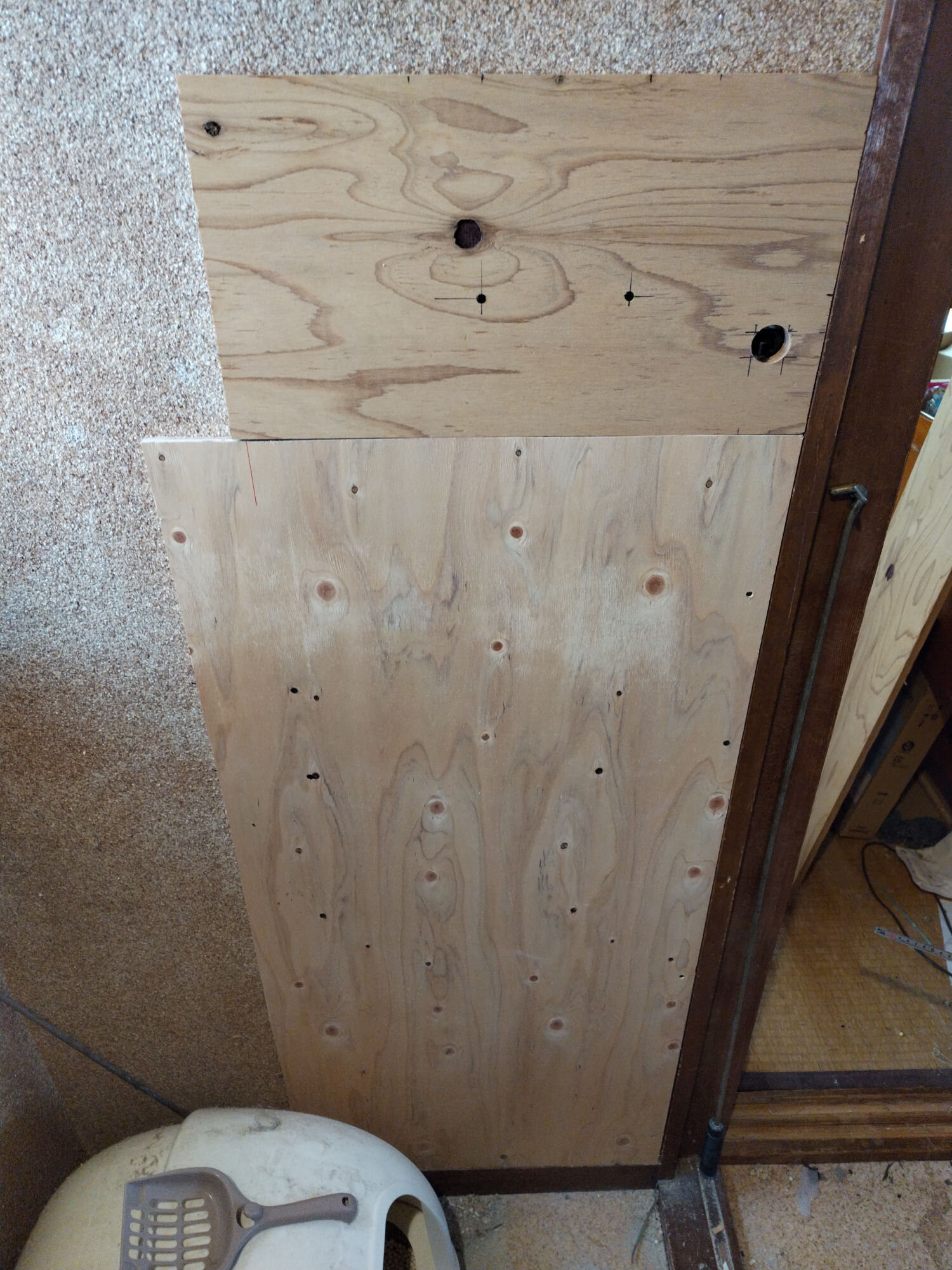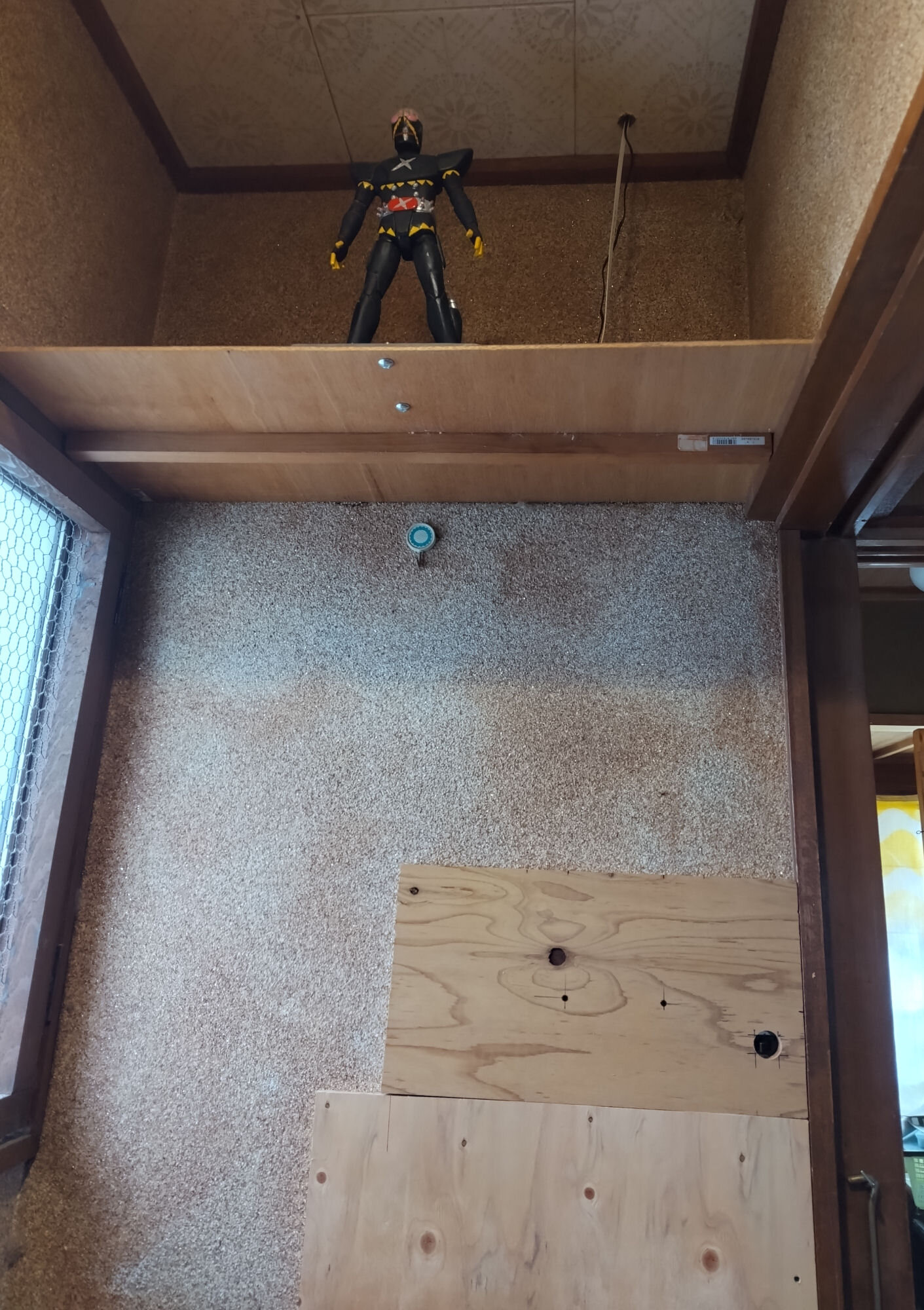 余ったコンパネを貼るのだが、ここも砂壁なのでやっかい。壊れた壁の中にある梁みたいなやつにさらに角材をネジ止めしてそこにコンパネをネジ固定することにした。
