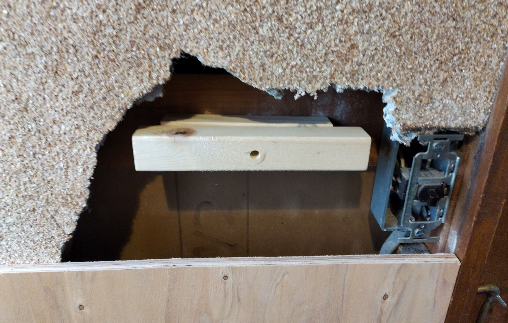 上から板を貼って角材部分にネジ止め。以外としっかり固定できた。照明のスイッチはドリルで丸穴開けて通した。