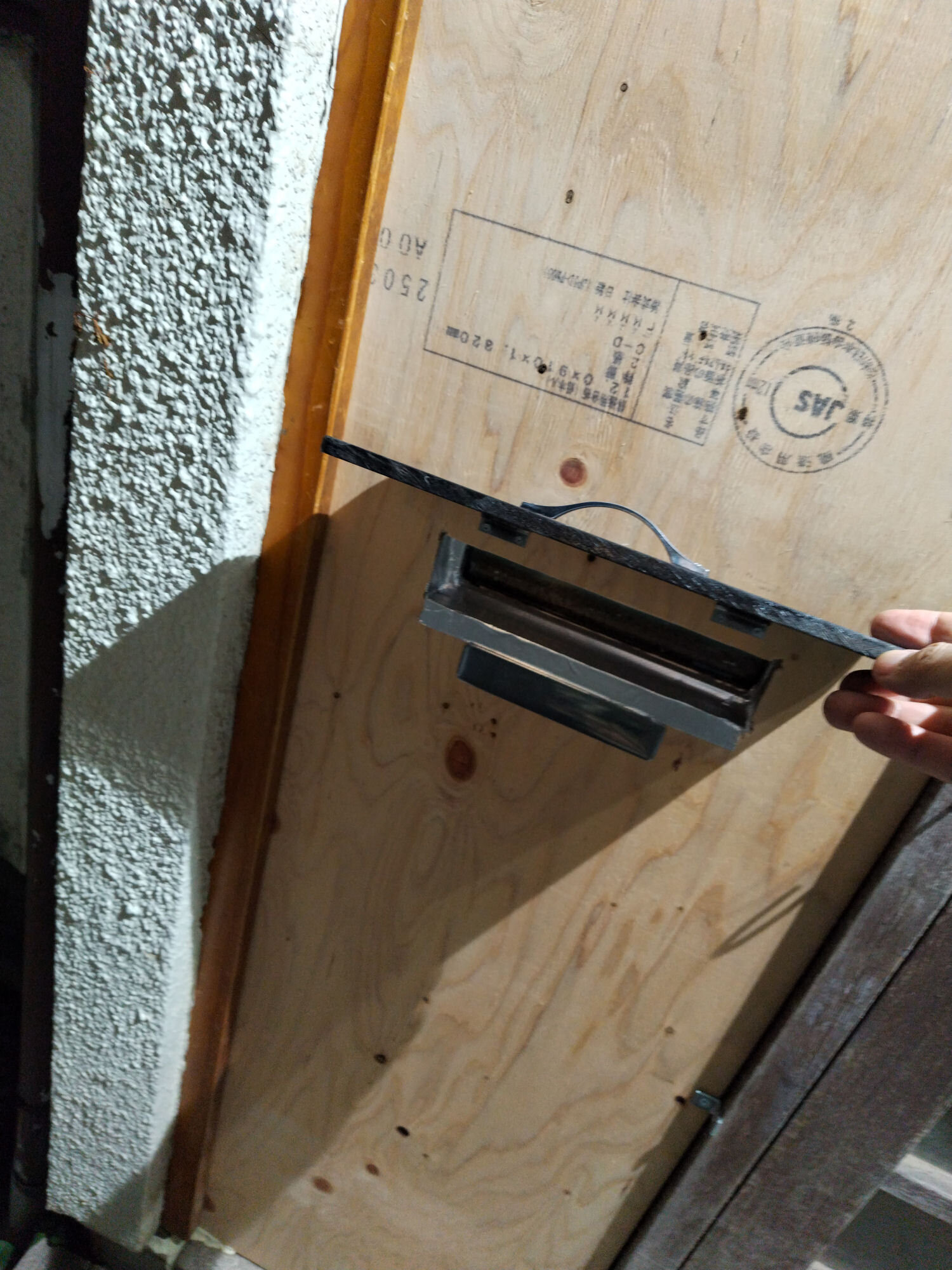 結局コストは、ジョイホで買った固定用のL字金具300円と郵便受けの蓋の板200円。あとは家の残り物を使った。結構頑張った。