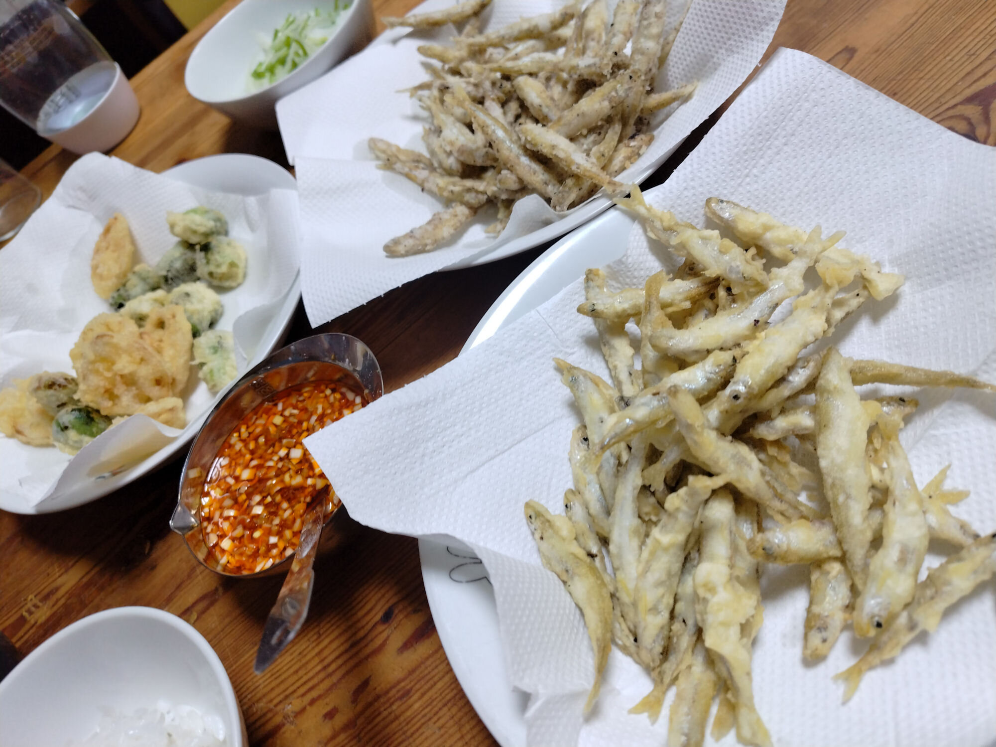 次からは、天ぷらにした残りははじめから全部南蛮漬けで良さそうだ。そしたら野菜天はなくてもいいので、南蛮漬け作ったらあとはワカサギ天だけ食べる直前に作ればいい。それと、この即席南蛮漬け作戦は全釣果唐揚げに使えると思った。