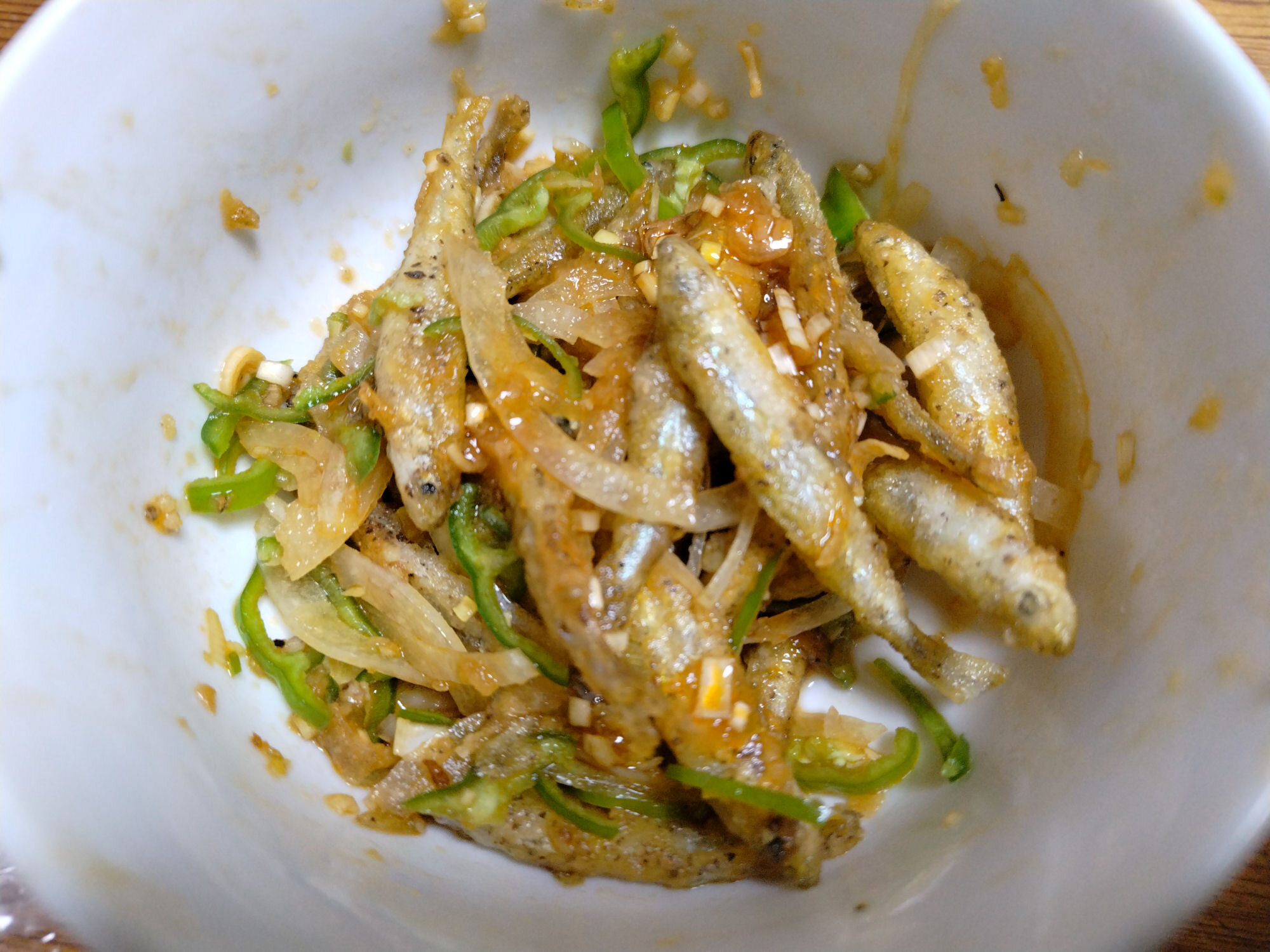 塩こしょう片栗粉をまぶして揚げたが、釣ってるとき近くで釣ってる人が「南蛮漬けがうまい」と言っていたのが引っかかりタマネギとピーマンをスライスして中華ダレを添えて即席南蛮漬けにしたらアタリだった。残ったやつはそのまま和えて翌日南蛮漬けで喰った。