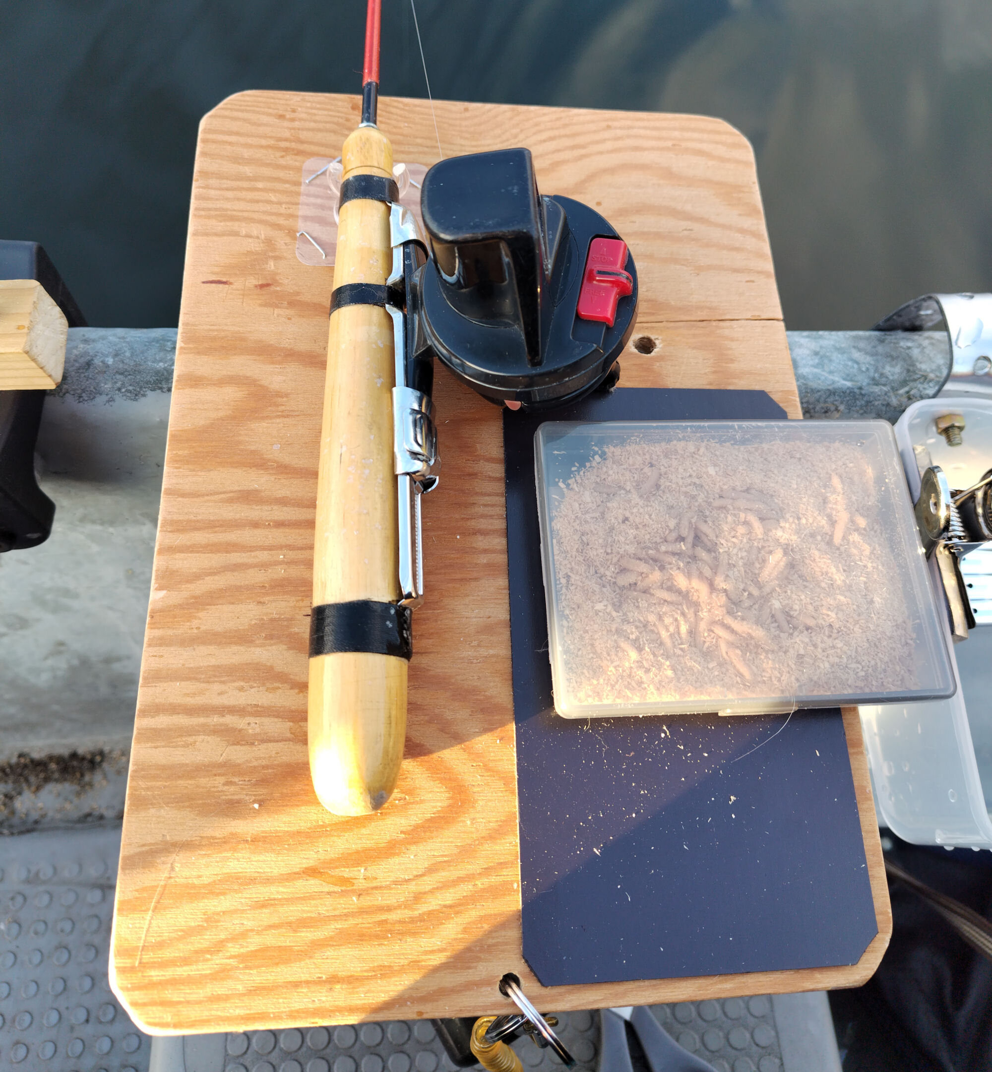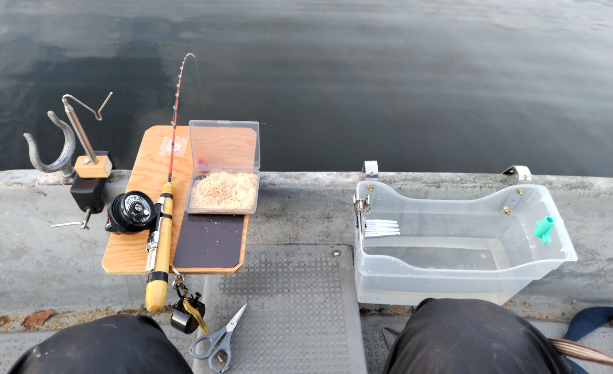 針外し、ワカサギアンテナはさすがに皆が常用するだけあって便利だった。活かしケースもよい感じ。手返しは前回と比べて格段に楽になった。竿の置き場はやはりイマイチ落ち着かない。ここはもうちょっとカスタムが必要だ。逆に餌ケースは大成功でカードホルダで蓋つきで深さも丁度よくマグネット効果も絶大だった。