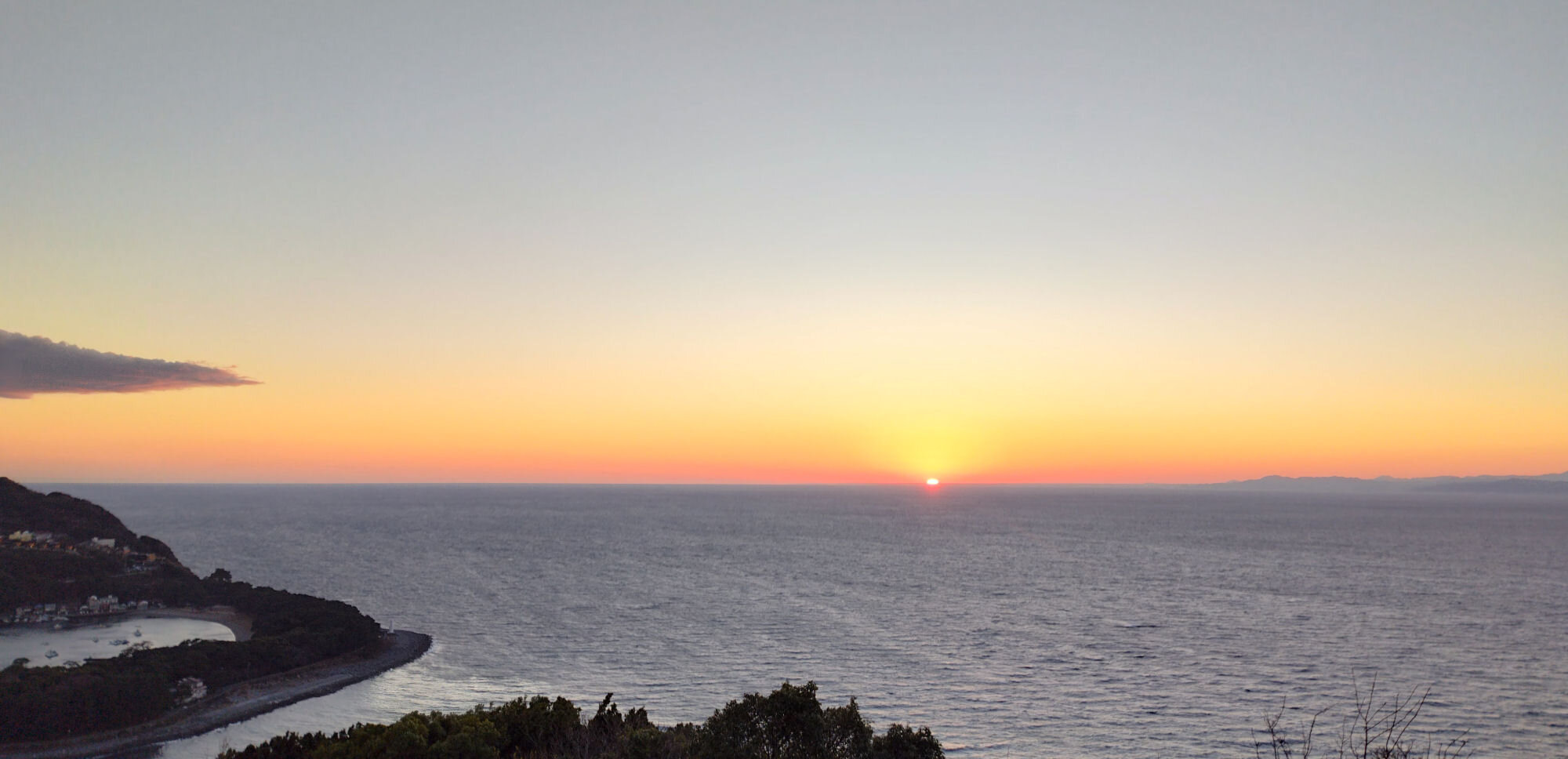 16時半くらいに出発。ふと横見たらまさにちょうど日の入り間際で景観スポットで一応写真撮る。