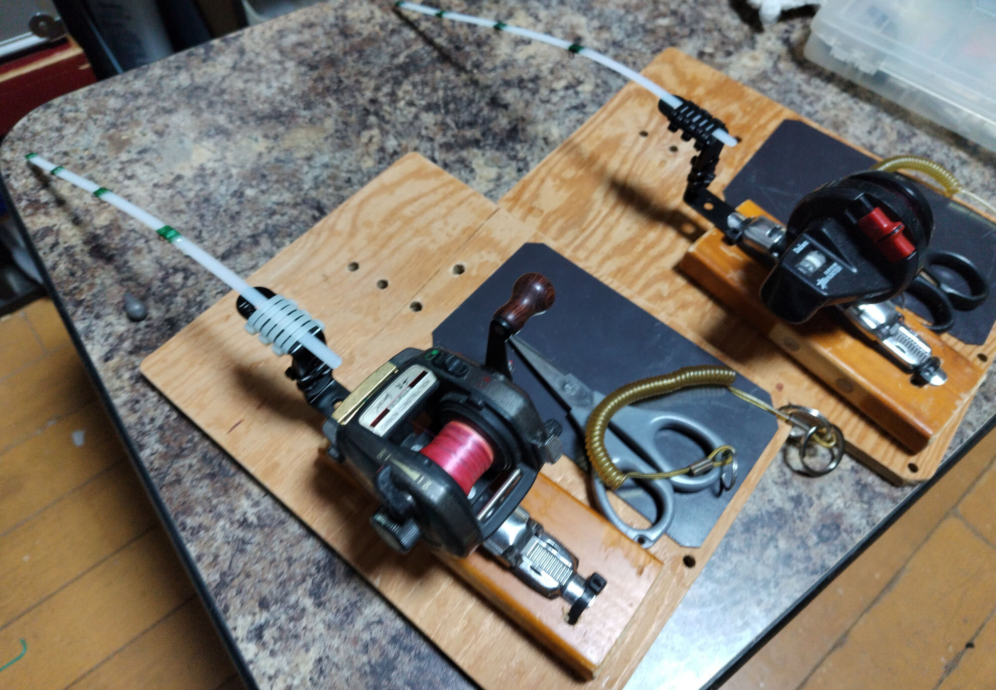参考サイトからいくつか仕様は変えている。土台はジョイントマットだと置いたときぐらぐらするため木製に変更した。リールシートは板に2箇所ずつ穴を開けて結束バンドを通して固定しているが、接地部分はぐらつかないように板を削って溝を掘った。また、ガイド部分は動画では0.5mmの針金を巻いて作っていたが、ダイソーで見つけられなかったので安全ピンを加工した。固定方法はこれまでのガイド補修のやりかたを踏襲して2液エポキシで固めた。ラインは一応ワカサギ用PEにしてみた。
