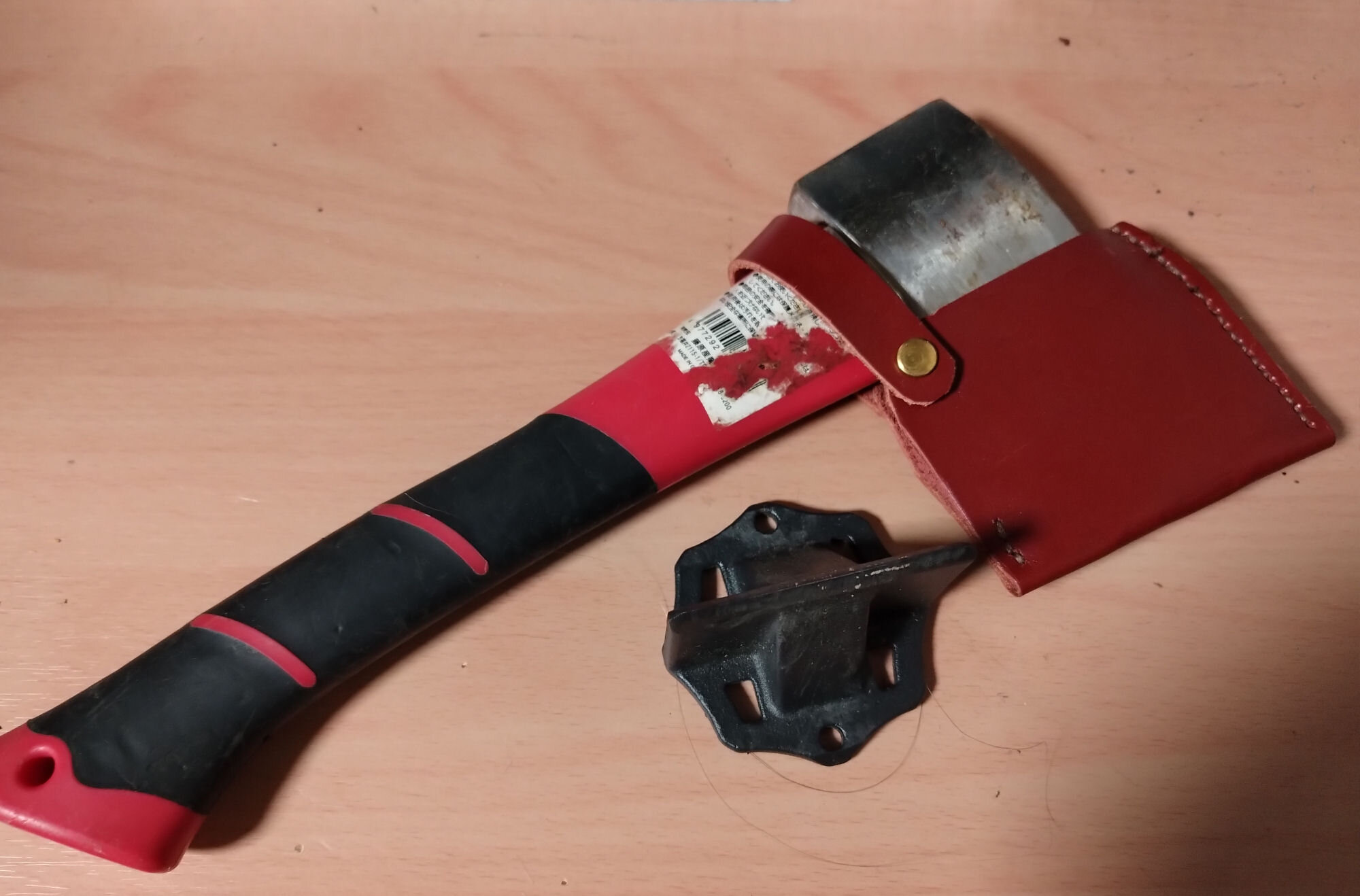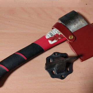 ひよが斧のカバー作ってくれた。カバーは外さず後頭部でまきびしくんのハンマーとして活躍。ハンマー刃を隠す。