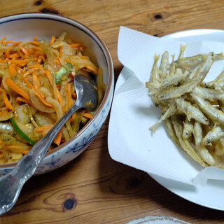 今回も天ぷらと南蛮漬け。1時間くらいで用意できるしうまいしもうこれが定番でいいや。