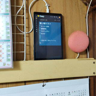 GoogleKeepの買い物リストをひよのGoogleアカウントと共有。Fpad7は台所の壁に設置。Fully Kiosk Browserというデジタルサイネージアプリを入れてWeb版のGoogleKeepを表示30秒おきに自動リロード。買い物リストを追加するときは、Google Nestに「○○、買い物リストに追加」と言うか、各自スマホでkeep登録。削除するときは、各自スマホでKeepからチェック入れると消える。自動リロードかけてるので追加削除するとすぐ反映されておもしろい。