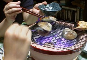 さて、焼き蛤には重要な問題があります。焼けると蛤は威勢良く開きます。テレビを見ていると、左の写真のように美しく開きます。おいしそうですねえ。でも、あなたは知るでしょう。大自然は決して人間の都合に合わせて存在しているわけではないのです。 そう。蛤を焼くと必ず身が上になって開くのです。 そして無情な重力の法則に従って蛤は一回転。あなたは叫ぶだろう。「ああああ!おいしそうな蛤の汁があぁぁぁぁっ!」 勿論私たちも何度も叫びました。そして何度も叫びながら私たちなりの手法を編み出しました。 1.貝が開く 2.すかさず汁を小皿に避難させる。 3.身が上に剥がれてきたら貝を殻ごと裏返す。 4.小皿から身に汁を垂らす。この時酒を垂らしても良い。 5.完全に火が通るまでよ〜く見張る (危なくなったらすかさずスプーンや箸で支える) 6.焼けたらペンチなどで殻をつまんで取る。 7.食べる。汁をご飯にかけるとすごくうまいぞ。 これであなたはおいしい汁を失うことなく蛤を堪能できるのです。是非お試し下さい。しかし、汁を失わないための注意には異常なまでに神経を使います。我が家の食客さやか嬢も「神経使いすぎて肩が凝った」と証言しています。おいしいものを食べるには相応の苦労はつきものなのです。 参考までに、一般的な回避策には以下の方法があるらしいです。しかし、我々蛤研究会では全て不許可になってしまいました。教えてくれた方々すいません。 A.垂直に立てて手を離したとき、ひっくり返った方が下 生活便利百科より。結論:だからどうした!?これは全く 役に立たない。これはあくまで上下の見分け方。焼く面が 蛤の上だろうが下だろうが蛤は身が上に開くのだ。我々は この結論を導くのに数多くの蛤を犠牲にすることになった。 どっちが上だろうが焼き蛤の際には知ったことではないの だ。 B.あらかじめ蛤の蝶番をを切っておく。 こうすると貝は始めから開かない。だから汁はこぼれない。 しかし君はあの勢い良く開く貝の断末魔を見ずして蛤を食 べようと思うだろうか。その蛤との真剣な命のやりとりを オーストラリア人のように見ない振りをして君は幸せか? と言うわけで却下。却下。 C.焼く面に塩または片栗粉を十分まぶしておく。 考え方としては下側と上側の温度差を少なくして、下が先 に貝柱が外れることを防ごうというものだ。実に論理的だ。 うーん。しかしこれは何故かうまくいかなかったのです。 ひょっとしたら直径7cm位を越える大きな蛤を焼くときに は有効なのかもしれない。なぜだめなんだろう。謎だ。 |