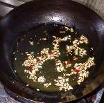 3. にんにく、鷹の爪をやや低温でこんがり揚げるように焼く。色づく直前に火を止める。