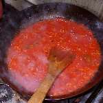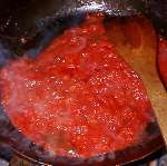 4. トマト水煮缶を流し込む。油がすごくはねるので要注意。