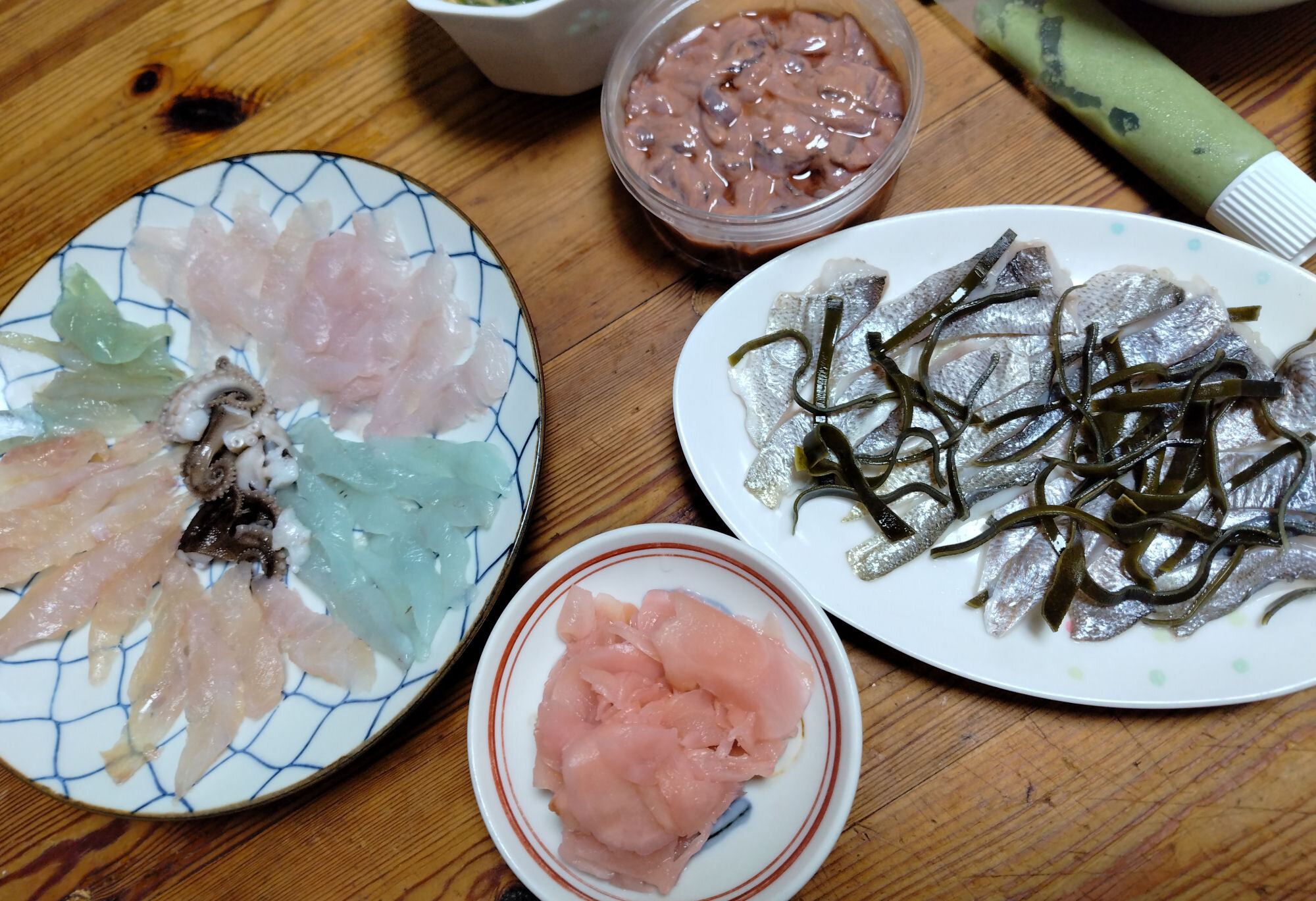 22センチベラとアナハゼ2尾は刺身。それぞれ半分は昆布締め。イイダコは湯がいて盛り付けたらなんか5色盛りになった。